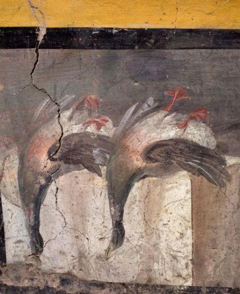Κοτόπουλο και δύο πάπιες που κρέμονται ανάποδα ξεχωρίζουν στις ζωγραφιές, ενώ στο χώρο βρέθηκαν υπολείμματα από υλικά που χρησιμοποιούσαν στα γεύματα.