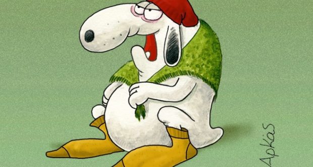 Στο σκίτσο πρωταγωνιστεί ένας σκύλος που είναι ντυμένο σαν «κρεμμύδι» και ρωτάει: