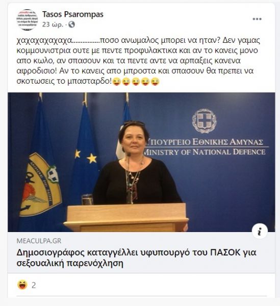 Στην ανάρτηση, που έσβησε στην πορεία, χρησιμοποιούσε απαράδεκτες εκφράσεις, και για να δικαιολογηθεί είπε ότι «δεν είχε σκοπό να προσβάλει τις γυναίκες αλλά το ΚΚΕ με το οποίο μας χωρίζουν πολλά». Μιλώντας στο protothema.gr, συμπλήρωσε μάλιστα ότι η ανάρτηση «ήταν λίγο λάθος».