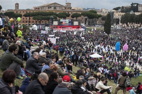 Η συγκέντρωση εναντίον του νομοσχεδίου έγινε το μεσημέρι του Σαββάτου στο Τσίρκο Μάσιμο της Ρώμης. Οι συγκεντρωμένοι ήρθαν από διάφορα σημεία της Ιταλίας -η Repubblica μιλά για περίπου 1.500 λεωφορεία στο Τσίρκο Μάσιμο από όλες τις ιταλικές περιφέρειες.