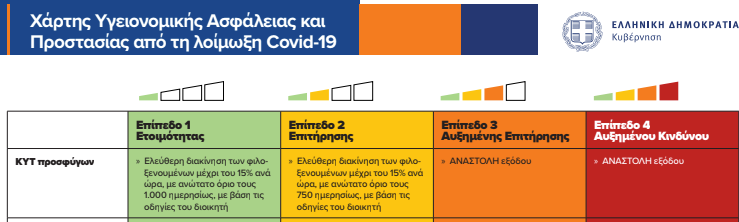 - Επίπεδο 1: Ελεύθερη διακίνηση των φιλοξενούμενων μέχρι του 15% ανά ώρα, με ανώτατο όριο τους 1.000 ημερησίως, με βάση τις οδηγίες του διοικητή.