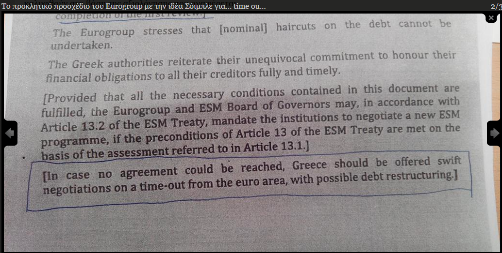 Στο τέλος του κειμένου και εντός παρενθέσεως, εμφανίζεται και η περίφημη ιδέα Σόιμπλε για προσωρινό Grexit: «Σε περίπτωση που δεν υπάρξει συμφωνία», αναφέρεται στο draft, «θα μπορούσε να προσφερθεί στην Ελλάδα διαπραγμάτευση για ένα time out από την ευρωζώνη με παράλληλη αναδιάρθωση χρέους». Η προκλητική αυτή αναφορά μπήκε στο τέλος και σε παρένθεση διότι δεν συμφώνησαν όλοι οι υπουργοί Οικονομικών.