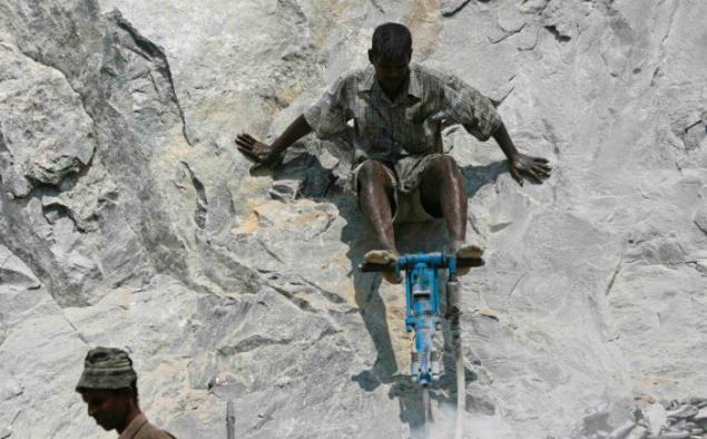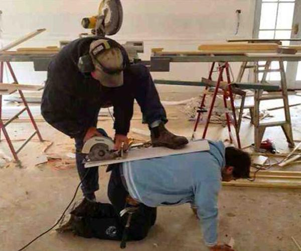 BBW345 worker trying to kick wood into a chipper in an unsafe and unprotected way (how not to use a wood chipper)